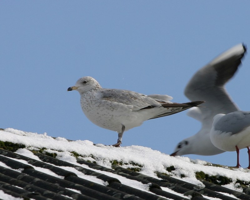 Dette billede viser særligt godt, hvor lyst grå den Ringnæbbede er på oversiden sammenlignet med Stormmåger (der kan være Russisk Stormmåge involveret her; disse har generelt mørkere grå overside end hjemlige fugle). Oversiden her er jo næsten gråmågefarvet! Bemærk også, hvor slidt de juvenile dækfjer er - næsten alt mønster er afslidt. Tydeligvis har arten en lidt ringere fjerkvalitet end Stormmåge, da det er almindeligt at se dette slid allerede om efteråret. Her sidst på vinteren er Stormmågerne fortsat ganske pænt tegnede på dækfjerene.