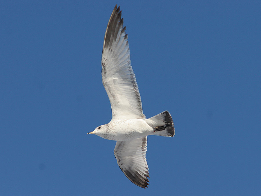 Denne vinters velbesøgte Ringnæbbede Måge er ret pudsig ved at være temmelig avanceret i sin dragtudvikling. Den har således fældet et antal inderste vingedækfjer (hvor Stormmågerne ikke har fældet noget), ligesom næbbet allerede er blevet let gultonet, og - hvilket er helt normalt - har fået lys næbspids. Stormmågerne har fortsat 1. vinternæb med heldækkende sort spids. Under meget gode forhold anes at øjet er begyndt at lysne svagt.