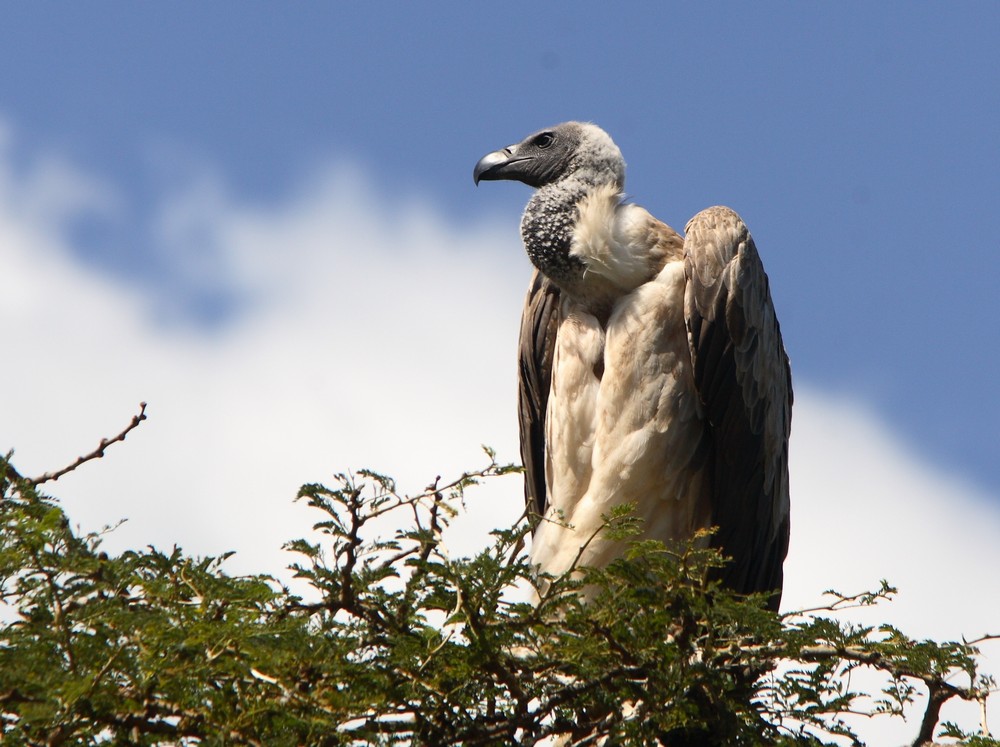 Beskrivelse: Hvidrygget grib venter på at løverne skal forlade den dræbte zebra i nærheden.