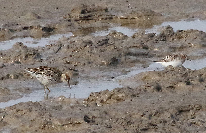 Beskrivelse: Arten er nok den hyppigste nearktiske vadefugl som hit i Østasien, men fortsat ikke almindelig - vores guide, Lin Zhang, betragtede den i det mindste som turens højdepunkt. Sneppekliren ses nederst til venstre sammen med ryler og mongolsk Præstekrave - øverst i billedet Sibirisk Hjejle med fin størrelses-sammmenligning til Strandhjejlerne til venstre.