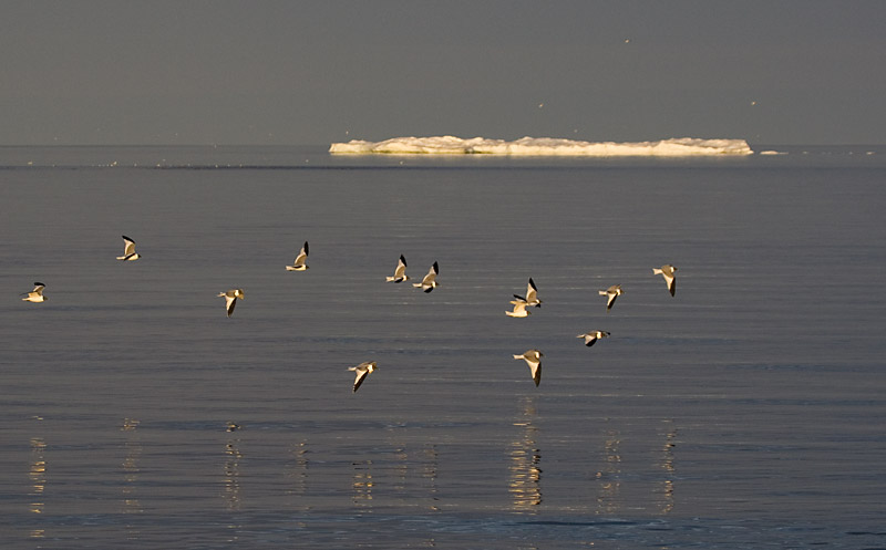 Beskrivelse: Ederfuglene opførte temmelig socialt. Ofte holdt en lille gruppe hunner en rugende hun med selskab, og her er det altså en død artsfælle der får selskab. med hvalrosser i baggrunden.