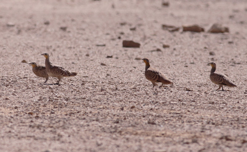 Beskrivelse: Områderne bag Ovda-lufthavnen nær Eilat har i de senere år været favoritlokalitet for ørkenfugle som lærker og sjove stenpikkere, samt sandhøns. I 2013 var småfuglene stort set ikke tilstedeværende, men til gengæld var Kronet sandhøne ret enkel. Kommer man fra Eilat kører man forbi lufthavnen og imod Beer Sheva. Et par km. efter lufthavnen går en vej mod højre - en lang, lige én. Efter nogle km. ser man på højre side et bakkedrag og det er mellem her og vejen, sandhønsene tid ses flyvende. Kører man længere frem når man til en militærlejr, og vejen går nu skarpt mod venstre. Man kører frem ad denne til man ser et sted med udlejning af ørken-motorcykler m.m. den flade slette 500-1000 m. før dette sted er hotspot for sandhønsene - eller var det i 2013.