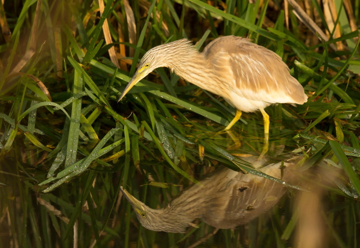 Beskrivelse: De fire Snegås x Grågås på marken. Bemærk variationen i deres fjerdragt især på hoved og hals.