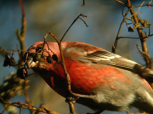 Beskrivelse: Several Danish birders have traveled to southern Sweden this winter to look for Pine Grosbeaks.