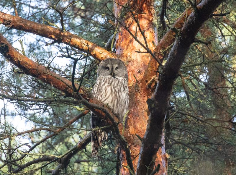 Beskrivelse: Uglen set i perioden fra Nytårsdag til foreløbig 10. januar 2023 rastende typisk højt i ældre fyrretræer