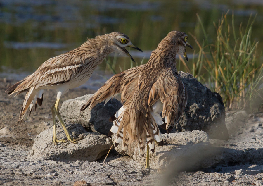Godt spørgsmål. Enig i din betragtning, hvis det er kurtisering, så er det sent - i forhold til hvis kurtisering alene finder sted før ynglen - men véd vi det, når det drejer sig om Triel ? Dit andet bud "kamphaner" giver ikke så meget mening i min optik - det var ved flere lejligheder jeg oplevede denne spillen op. Og, det virkede for mig som om det var de selvsamme fugle, som havde ligger ganske nær hinanden og hvilet sig på det udørrede mudder i "evigheder". Karakteristisk for observationerne var netop at de blot "lå og lå" nærmest i timer, før de så endelig kom lidt action over dem, hvor de spankelerede lidt rundt, badede etc..