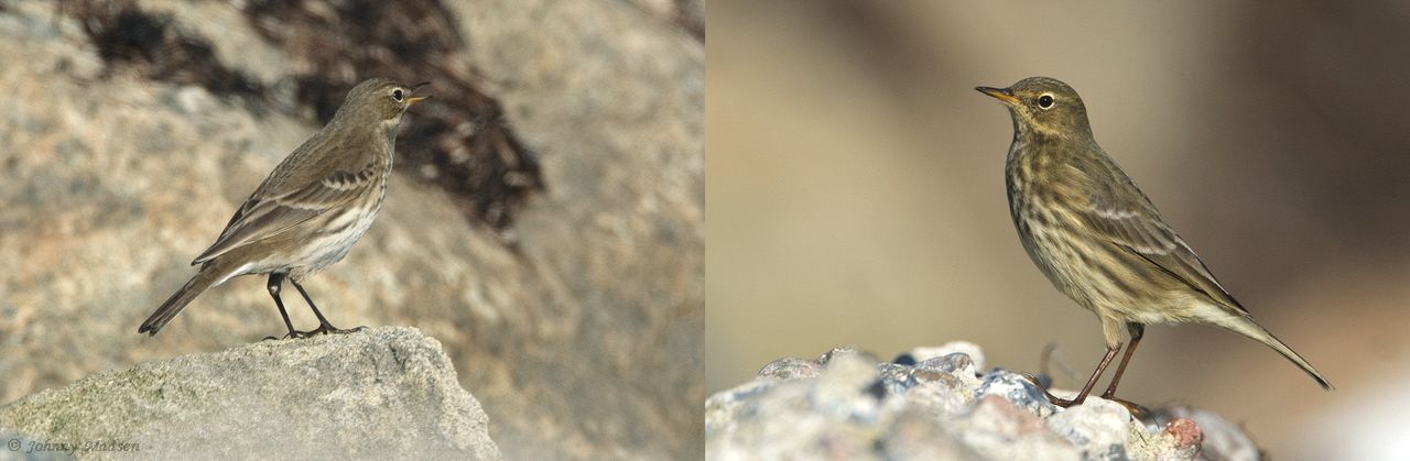 In my eyes, the bird in question (to the left) is without doubt a Water Pipit and not a Rock Pipit.