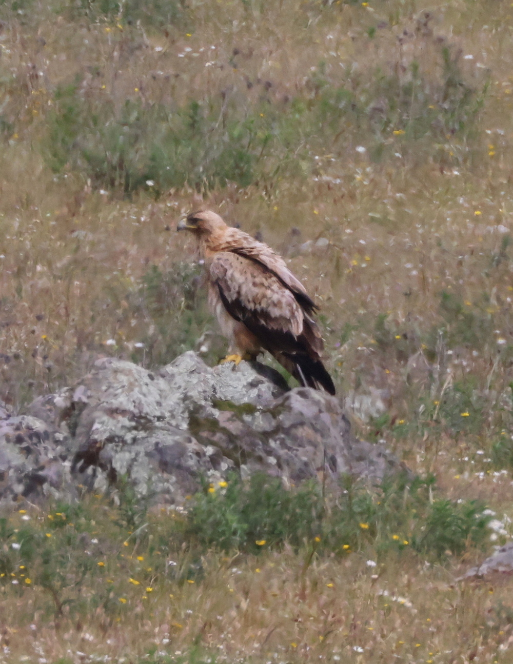I kan sagtens have ret. Denne fugl blev fotograferet i tusmørke, da den kom flyvende langs en trafikeret hovedvej nær Caceres på Extremaduras stepper. Fotografiet af den landende fugl blev taget under kørsel, og også billedet, der viser den siddende fugl er taget under ganske stressede forhold. Vi havde tidligere på dagen set spanske kejserøene adulte, og da observationen blev gjort midt i områder, hvor Spansk Kejserørn tit ses i immature udgaver tog vi det nok lidt for givet at det var en sådan - billederne er jo hjemme.