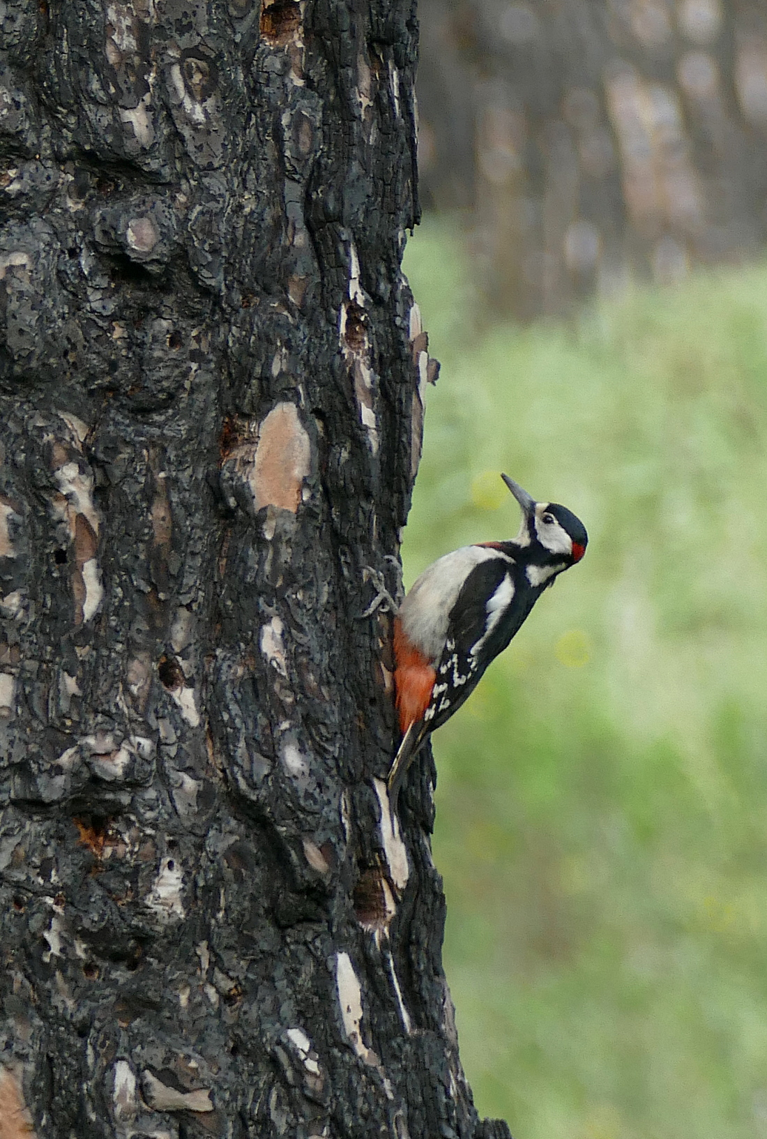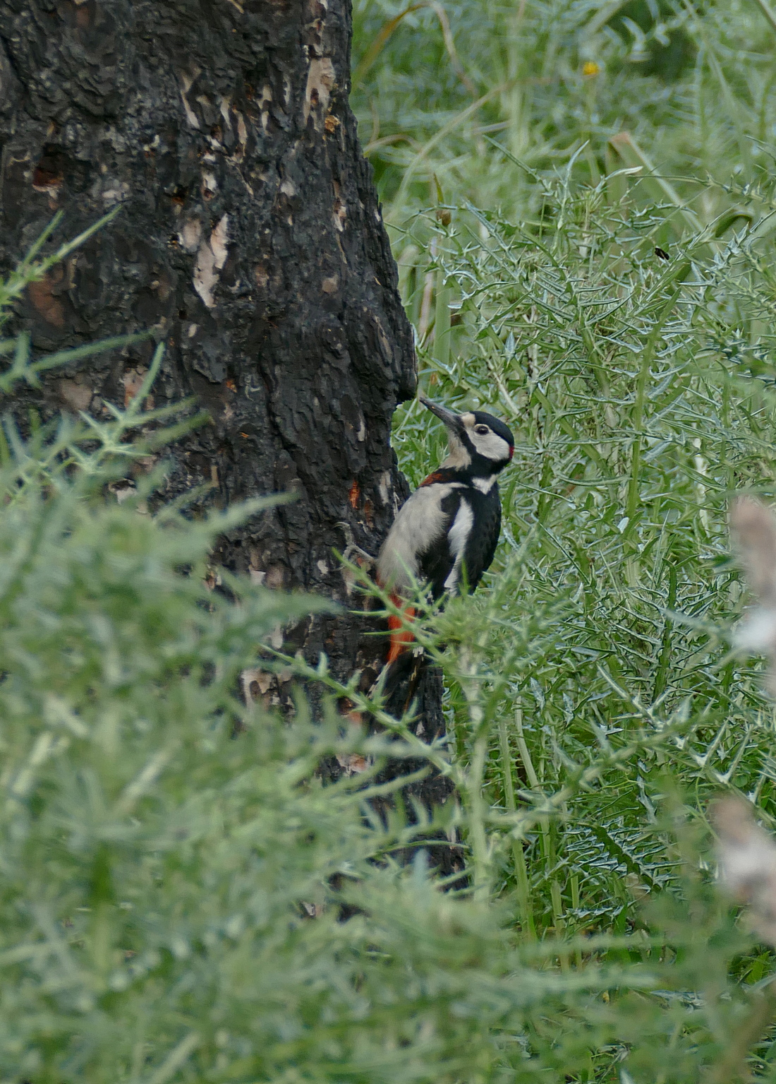 Beskrivelse: Sjældent har jeg set en Stor Flagspætte være bedre camoufleret end i den lettere afbrændte fyrreskov i Djebel el Ouahch-parken.