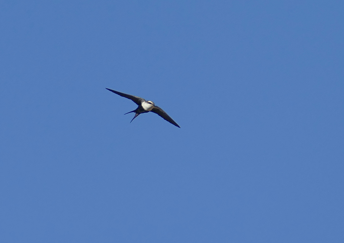 Beskrivelse: Et par af de meget delikate White-backed Swallow undersøgte en høj skrænt ved et udtørret flodleje, på jagt efter et sted at udgrave deres redehul, i stil med vores hjemlige Digesvale.