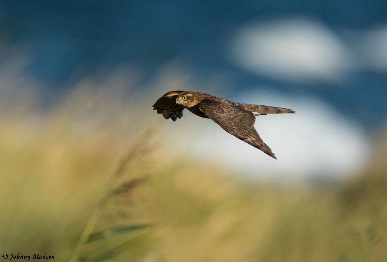 Beskrivelse: Det er en regel, at Blå Kærhøg har 5 synlige "fingre", mens Hede- og Steppehøg kun har 4. Som en forberedelse til efterårstrækket er det på sin plads at gøre opmærksom på, at denne regel IKKE gælder 100% midt på efteråret, hvor Blå Kærhøg er i gang med fældningen af håndsvingfjerene, og derved mangler den ekstra 5te finger. Oftest vil dette give sig udtryk i et "hak" i hånden eller en halvt udvokset fjer, men i særligt grelle tilfælde er væksten af de nye svingfjer på et så tidligt stadie, at man ikke bemærker den fremvoksende fjer, hvorfor der er risiko for, at en sådan fugl fejlbestemmes til Steppehøg. Den viste fugl er et godt eksempel. Der er formentligt tale om en 2K hun (ret mørke indre armsvingfjer), og ved første øjekast ser den fin ud for Steppehøg, omend noget kraftigt båndet på krop og hånd. På den nederste vinge ser man akkurat en fremvoksende håndsvingfjer mellem 3dje og 4rde finger, hvilket gør fuglen til en Blå Kærhøg. Flere hunner af arten denne dag viste ligeledes kun 4 fingre, men alle var i et mere let gennemskueligt stadie af håndens fældning.