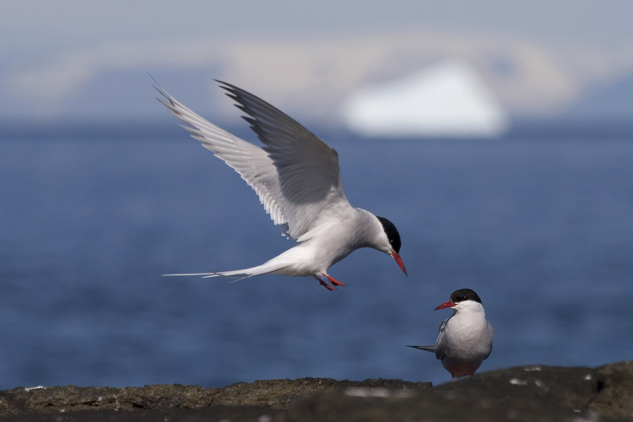 Beskrivelse: Nord for øgruppen Grønne Ejland ligger Ilulissat Isfjord og spytter den ene store isbjerg ud efter det andet, hvilket danner en fin baggrund for de rastende havterner på øerne.