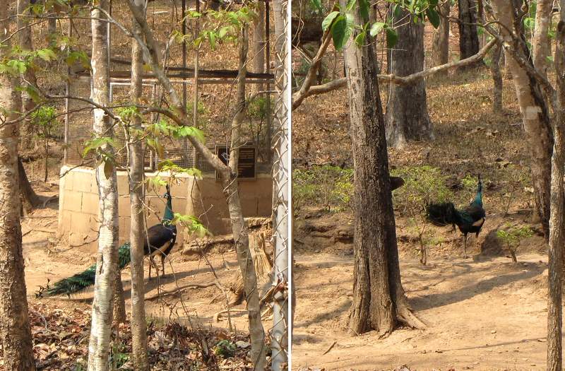 Vi besøgte stedet først på eftermiddagen, og så først en fin han sidde ovenpå taget af et af burene (kun lidt sky), og siden denne fugl, som først luskede væk i den store indhegning med Sambar Deer, og senere blev genfundet ved nogen fuglebure (moderat sky).