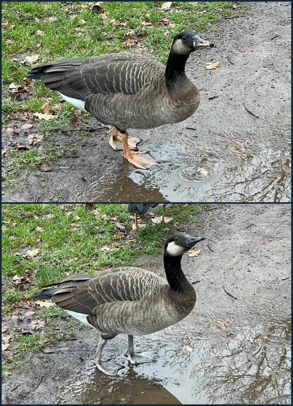 Beskrivelse: Begge fuglene var kun en smule større end grågæssene og mere brunt-tonede end Canadagæs i ren form er. Næb lidt afvigende, en fugl med mere smudsig kindplet end den anden, en med gule ben, en med grå-blå. Mon det kan være søskende - med forskelligt hybrid-udtryk ?