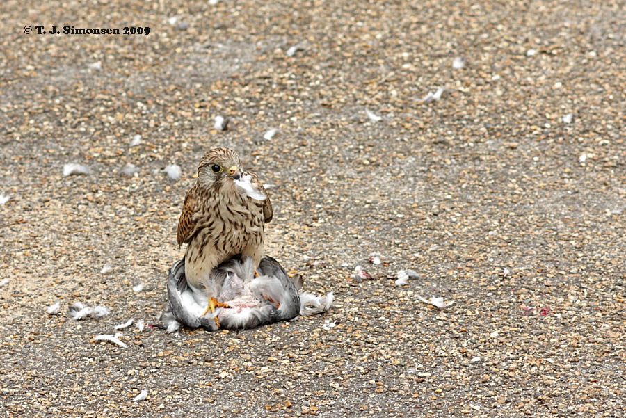 Hej Palle, Nej jeg så den ikke slå duen. Men udfra hvordan den sad går jeg udfra at den har taget duen på jorden (ikke i flugten).