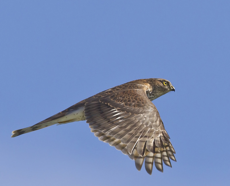 Hvis det var en Duehøg, måtte det sikkert være en adult med det fint tværstribet bryst - men så ville undervingens striber samtidig skulle være grålige og ikke næsten sorte som her.