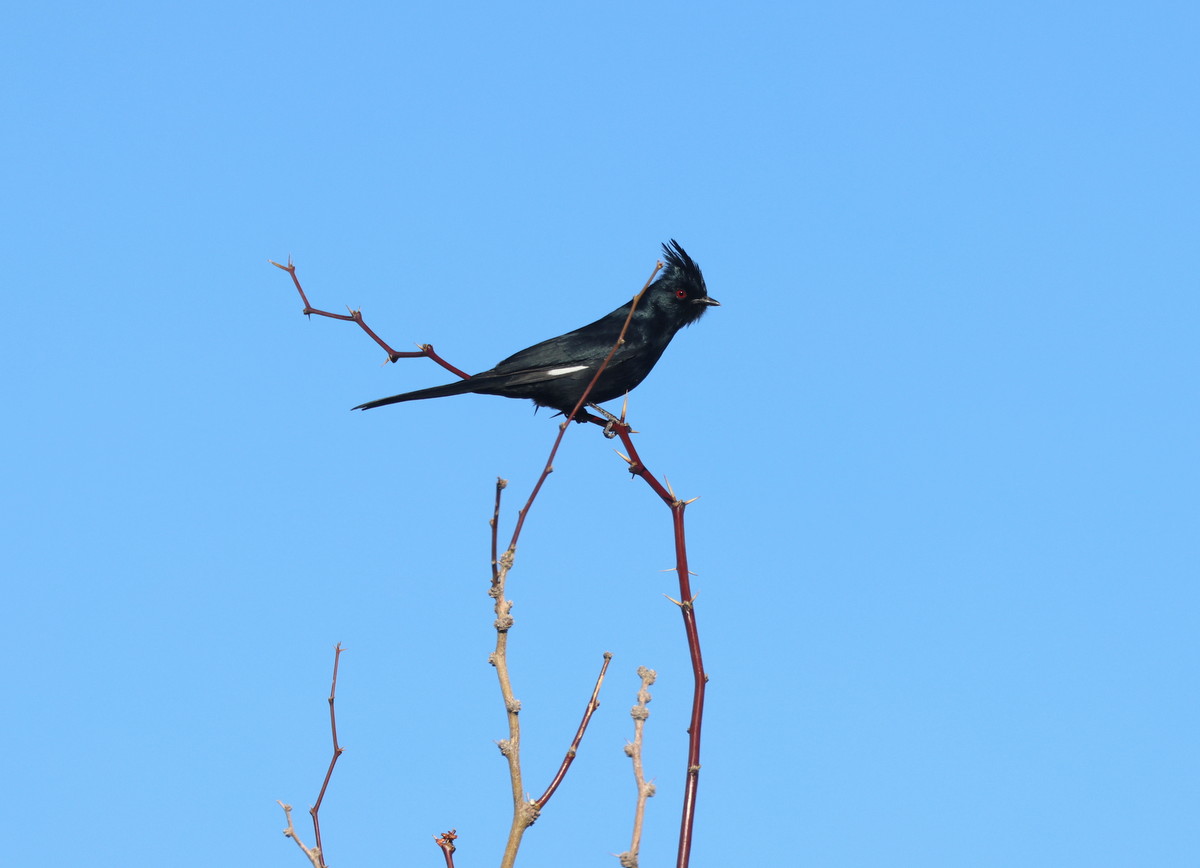 Titel: When not flying this male Silky-flycatcher often looks plain black, but it has big white wing patches visible when flying. Here one can see part of the white even if the bird is resting in the not yet out leafed mesquite.