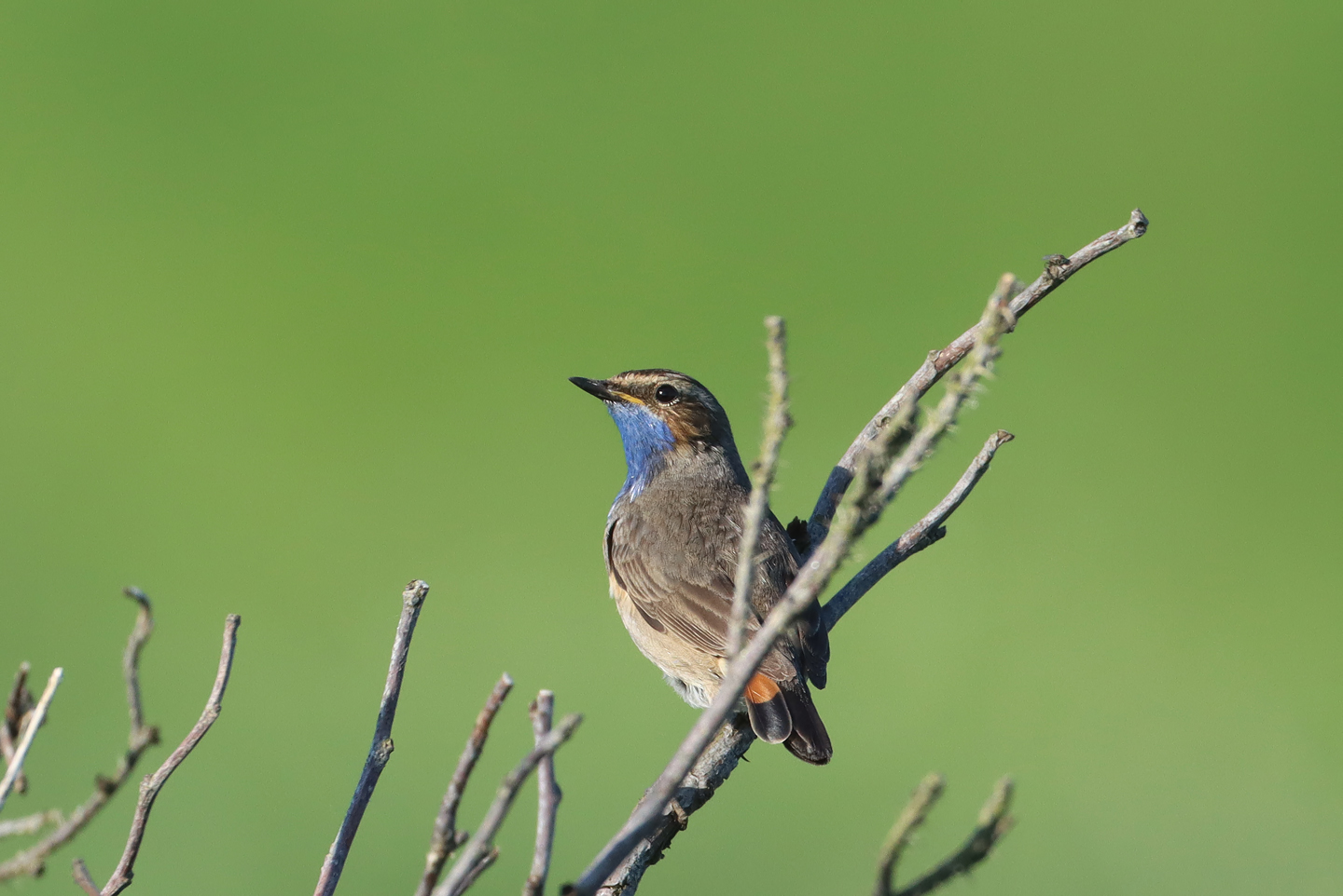 Beskrivelse: Hunnen med rede materiale sad under en meter fra hannen, som sang i vilden sky.