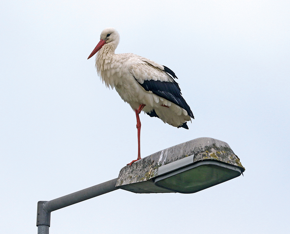 Beskrivelse: Hvid stork sidder og hviler på toppen af lygtepæl ved start af Søndergade og gammel Århusvej