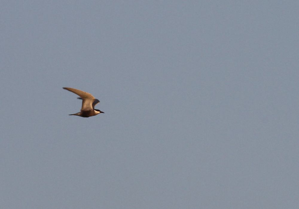 det kan jeg godt forstå, men billedet er også en smule overbelyst. Fuglen har en kort afsnuppet bagende. Observationsforholdene har været svære at arbejde under, det meste af eftermiddagen i forhold til at fastslå det helt nøjagtige forhold mellem hale-svingfjer-tertialer. Vi har dog været sikre på at der ikke er lange svingfjer der stikker bag tertialerne og dette stumpe indtryk af den bagerste del, den lige ryg der giver fuglen et næsten trekantet indtryk, den ringe størrelse, grå undervinger og fødder som sås tydeligt bag hale i flugt gjorde at vi godt turde melde den ud som sikker sibirisk. Jeppe Bundgaard opsøgte fuglen igen her til aften, hvor observationsforholdene og lyset var bedre og kunne faktisk ikke se svingfjer bag tertialerne.